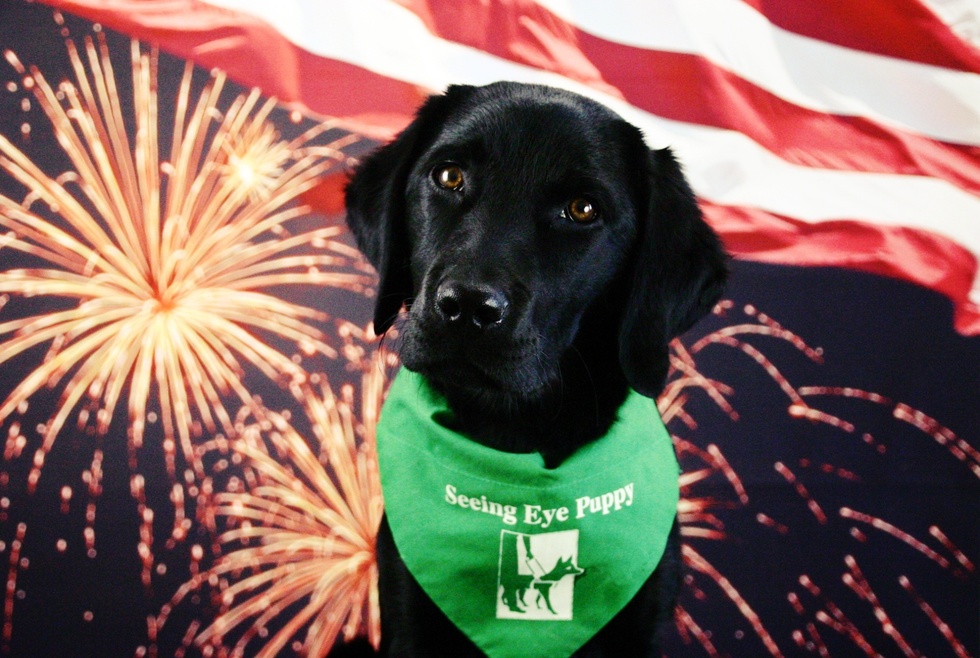 A six-month-old black Labrador/golden retriever cross named Lina sits close to the camera, looking just above it with sparkling brown eyes and her head very slightly tilted to the right. Her green Seeing Eye puppy scarf hangs in front of her, covering most of her chest. She sits in front of a backdrop depicting fireworks and the bottom red-and-white stripes of an American flag. The dog is calmly and proudly posing for the photo.