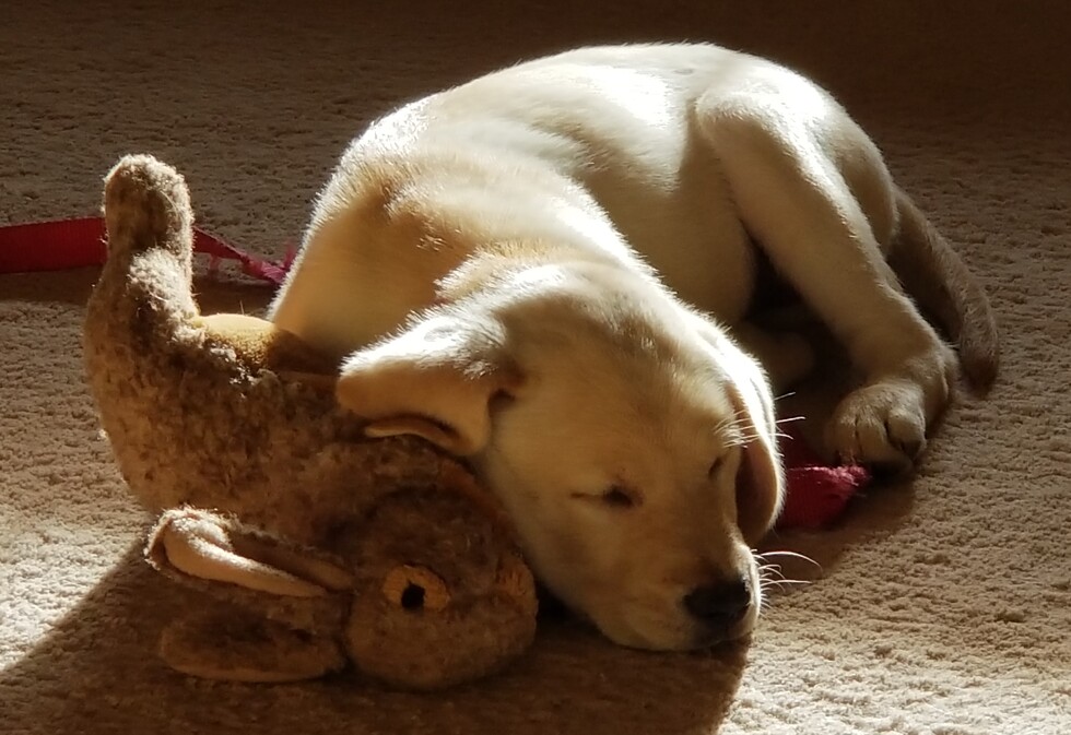 Florence found the Easter Bunny! A 10-week-old yellow Labrador retriever is pictured sleeping soundly on the floor as he snuggles with a brown stuffed bunny. The sun shines down on her golden fur making it seem so soft and shiny and you can clearly see the hairs of her whiskers and eyebrows.