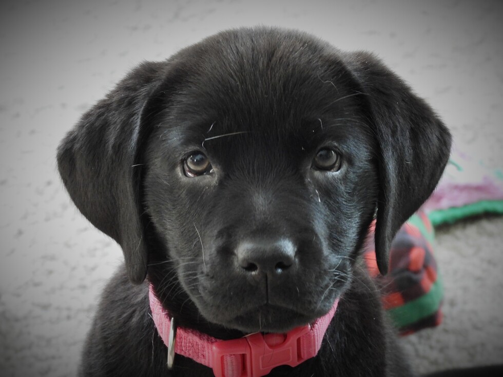 An eight-week-old black Labrador/golden retriever cross named Leona is seated on a white carpet. This close-up of her face shows her dark eyes staring directly and intently at the camera. Her onyx fur is contrasted by a bright pink collar. There are a few out of focus toys in the background.