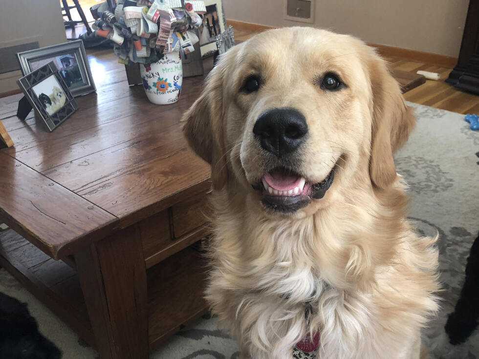Sitting in front of a wooden coffee table on a gray area rug is a full-sized male golden retriever named Cupid. On the table are dog and family photos as well as a handmade vase holding paper flowers. The handsome puppy is smiling right at the camera with his teeth and tongue exposed and his big dark brown eyes could just melt your heart! Slightly hidden under all his fluffy chest curls are his red, white, and black ID tags.