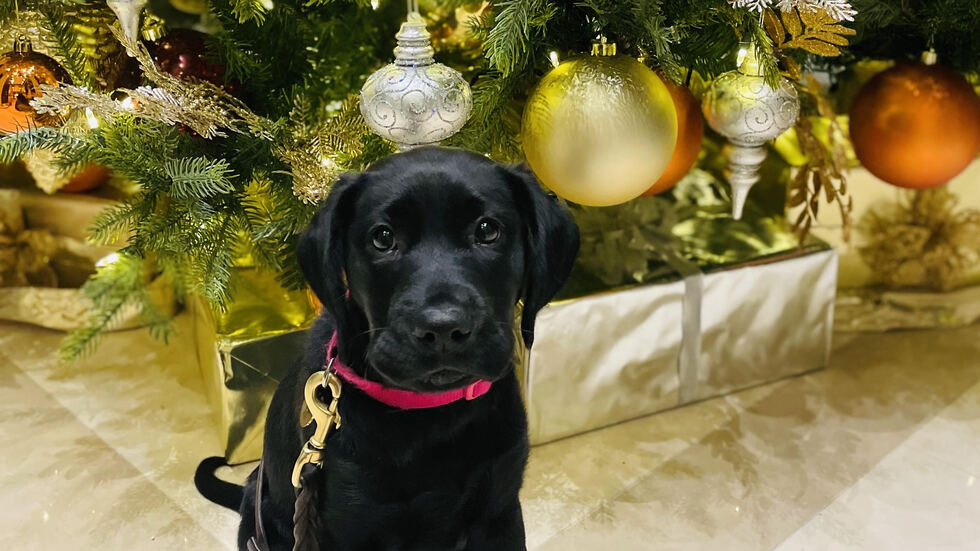 Oda, a very young female black Labrador/golden retriever cross, is sitting close to the camera in front of a Christmas tree. She is wearing a bright pink collar with a braided leather leash hanging from its left side as she looks to the left of the camera frame. Behind her is the bottom of a Christmas tree, adorned with large gold and orange ball decorations and silver drop ornaments. Sprigs of glittery gold and silver branches are sticking out of the green fir tree branches. On the floor beneath the tree, just behind the dog, are large presents wrapped in shiny gold paper and trails of sparkly gold ribbon wrapped behind them.