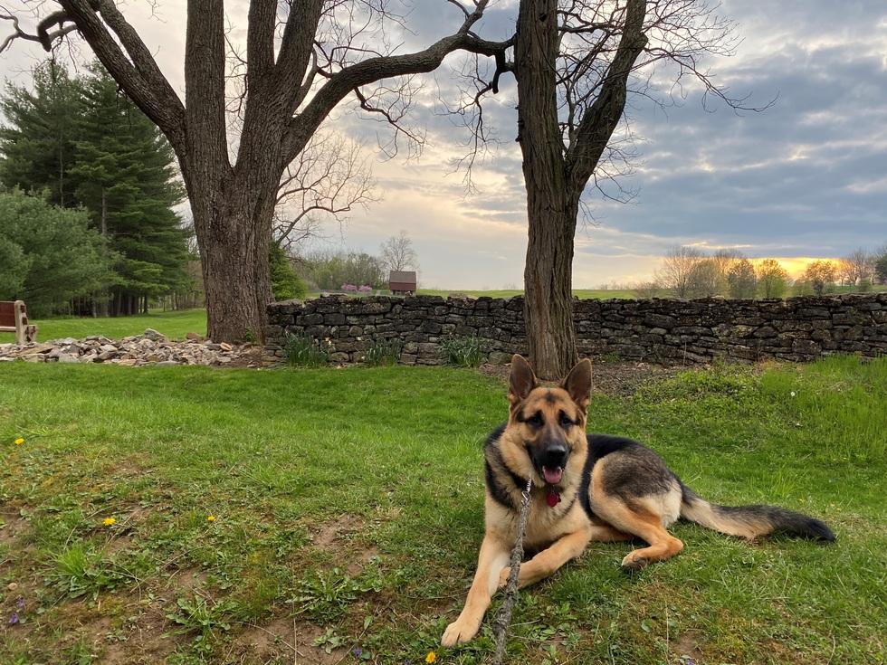 A fully grown black and tan German shepherd puppy named Upshaw is laying on short grass in front of a leafless tree. He is looking happily at the camera with his mouth open in a slight pant. Directly behind the tree is a stone wall and some pine trees. Almost perfectly centered between the two leafless trees, on a green hill beyond the stone wall, is an old red barn. The sky is full of blue/gray clouds and a beautiful, golden sunset.