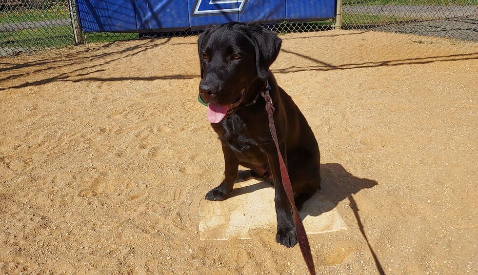 Safe at home! Pictured is Lincoln, a five-month-old black Labrador/golden retriever cross. He is sitting on home base at a local baseball field in town. His black fur is shining as he gazes into the distance enjoying the beautiful day. His pink tongue is hanging out as he relaxes after a nice walk. You can see his brown leather leash in the photo.