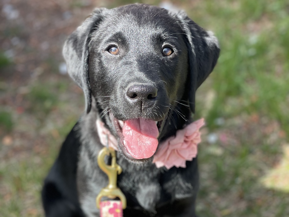 A sweet 11-week-old female black Labrador/golden retriever cross named Ingrid is sitting in the grass looking up the camera. She has beautiful brown eyes that sparkle in the sunlight and is smiling with her mouth open. Her pink tongue matches a large pink accent flower on her light pink velour collar as well as her flowered leash.