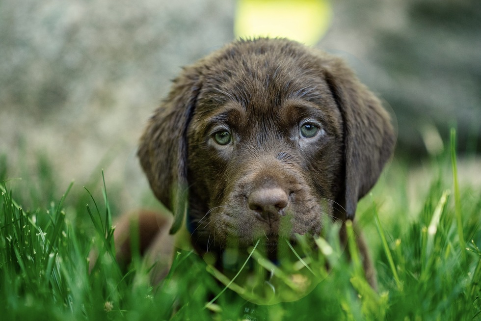 A seven-week-old chocolate Labrador/golden retriever cross is lying in grass. He is peeking over the top of the crisp green blades. His light hazel eyes are looking directly at the camera. His medium-length fur is wet with the morning dew.