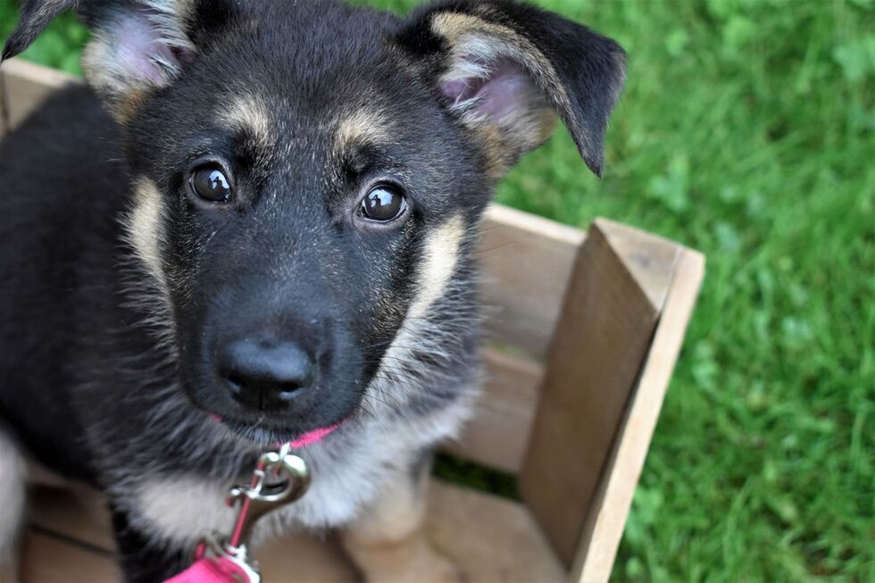 Portrait Mode is the name of the game for this expressive puppy. Meet Linda, an eight-week-old female German shepherd who is all face in this pose. She looks up inquisitively towards the camera from inside a wooden apple crate that contrasts in the lush green lawn. Her bright, shiny eyes are gently framed by her dark, floppy ears that have not yet grown tall. She has small, light brown markings above her eyes for extra expressive eyebrows. A light tan fur mingles into darker fur on her cheeks becoming tan again as it reaches her neck. Her fuchsia pink leash looks quite big for such a little puppy, but she'll grow into it soon. If you look close enough into Linda's eyes, the reflection of the photographer using Portrait Mode can be seen!