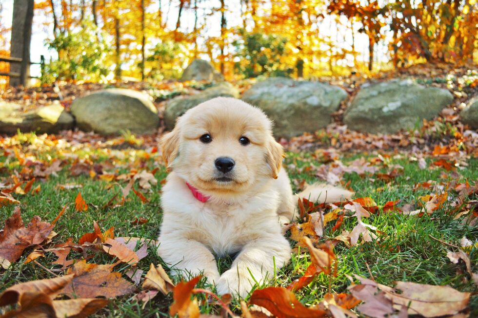 Odette, a tiny golden retriever puppy, has just arrived at her puppy raiser's home. Her little face is looking straight at the camera, laying with her little legs out front and a peek of her tail behind her. A piece of her "Big Girl" red collar is in view. Her expression is curious, with her ears down and a mischievous smile. The season is autumn; Odette is perched on grass surrounded by orange and yellow maple leaves as well as brown oak leaves that crunch in her movement. There is a stone wall behind her and a blurred background of a brilliant yellow and orange forest, back lit by a bright sky.