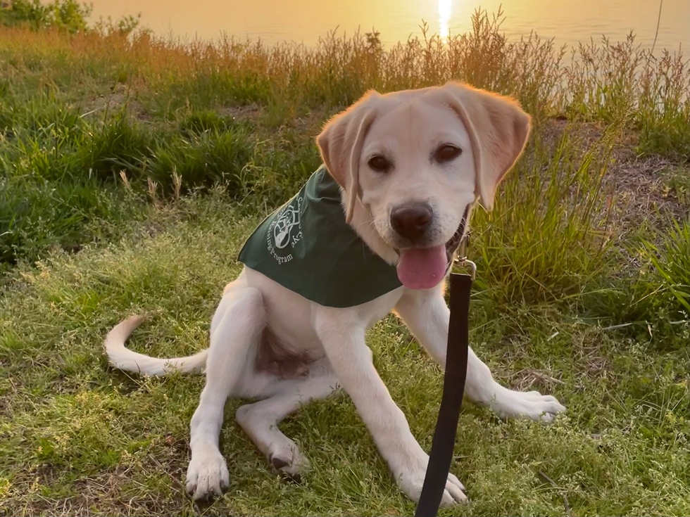 Vaughn is a five-month-old male yellow Labrador retriever puppy who is wearing his green Seeing Eye puppy scarf and a black leash. He is sitting comfortably in high grass after a long walk looking happily at the camera with his tongue out and his ears perked up. He is sitting on the edge of the Delaware River on the New Jersey side with the sun setting in the background making the background have a golden hue.