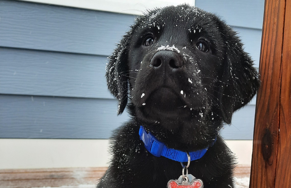 With snow dusted all over his face, Newt, a bright eyed eight-week-old black Labrador/golden retriever cross puppy looks up as if he is asking, "More Snow Please". His head shot reveals a fluffy black face with midnight black eager eyes and an inquisitive nose. He is wearing his new royal blue collar with a dog bone shaped dog tag. Behind him is a blue sided house with white trim.