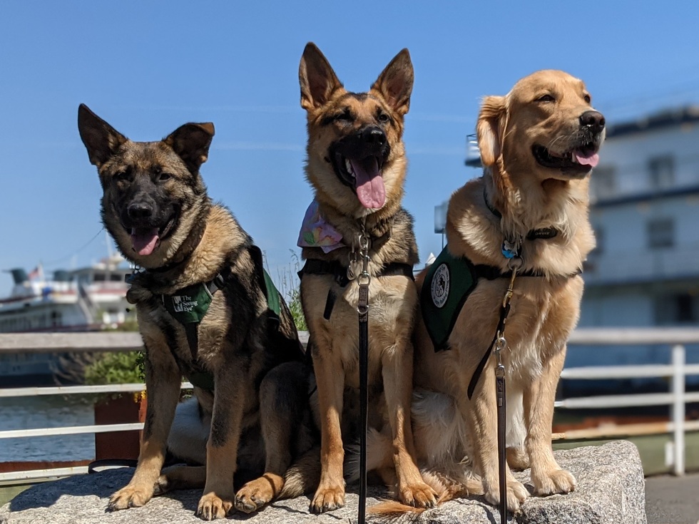 What a lovely threesome of Seeing Eye puppies, sitting together atop a large rock at Pier 86 in New York City. Boden, a gorgeous dark sable male German shepherd, has his left ear tipped down and sits slightly to the right. Holle, a stunning black and tan female German shepherd is sitting straight forward with her ears up and at attention. Lowell, a delightful male golden retriever, is looking slightly to his left; all dogs have their mouths open and tongues out. The view behind them is a spectacular cloudless blue sky with a ship in view to the left and a boathouse to the right. All dogs are sporting their green Seeing Eye puppy vests and are being very good dogs!