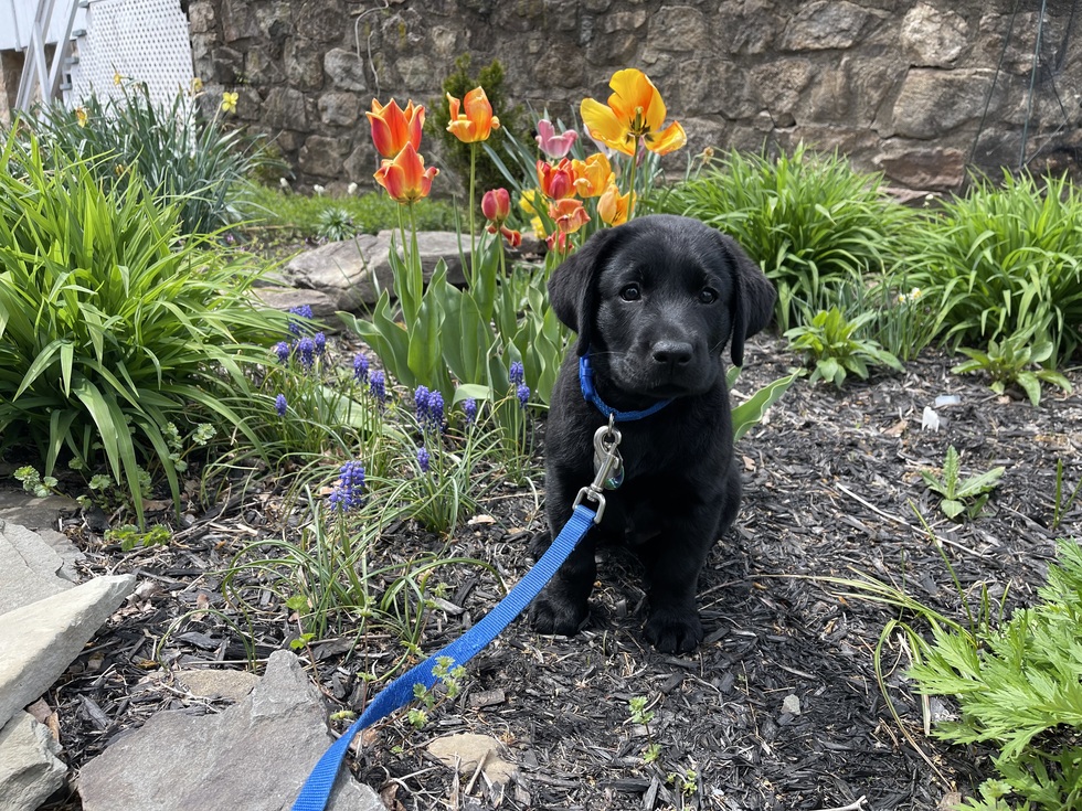 What happiness a spring garden brings but even more so with little puppy Larke, a black Labrador retriever, amongst tulips, grape hyacinths, and fresh green tufts of new perennials. His face is as refreshing as the plants and his new blue leash is attached to a matching blue collar. A stone wall is behind him, and a stone edging enclosed the garden. His puppy paws are large and will take he and his partner on many steps to come.