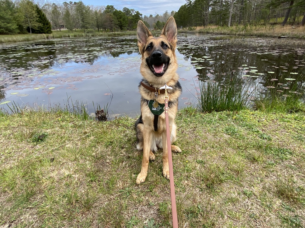 Meet Gilly, an 11-month-old black and tan German shepherd. She is sitting boldly upright on a grassy shore of a large pond scattered with lily pads. The photo is shot in an example of classic perspective with Gilly in front and the pond recedes back to a forest and a clouded blue sky. The photographer is holding Gilly's tan leather leash so it extends out of the front of the frame, and her regal expression is all smiles with mouth open and tongue out, ears straight up and perceptive to what will happen next.