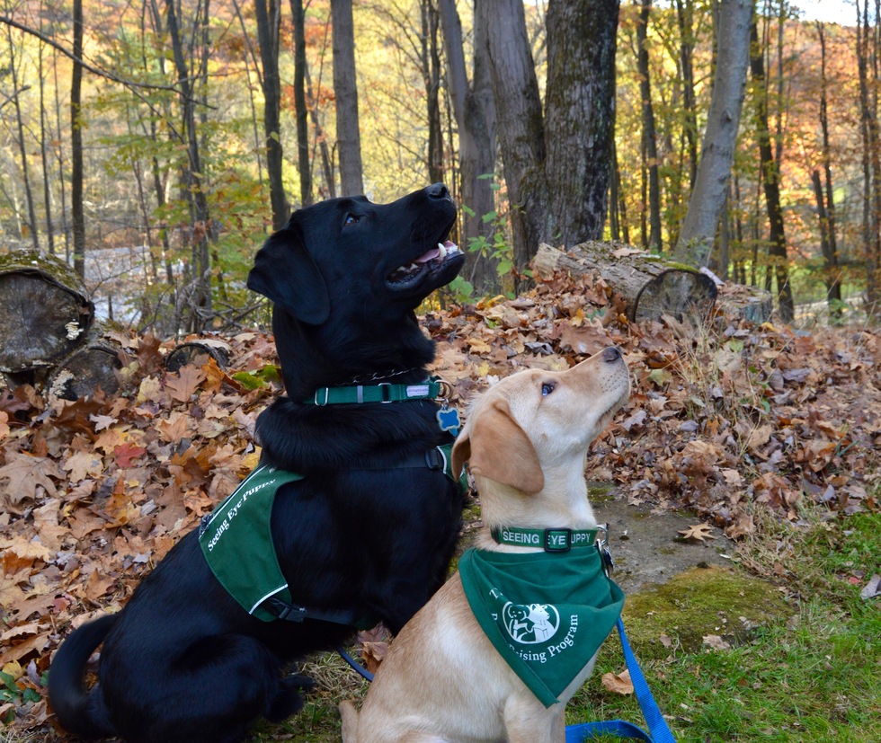 Joseph, a one-year-old black Labrador/golden retriever cross, is sitting with Kaya, a four-month-old yellow Labrador/golden retriever cross, in a wooded area in front of a pile of leaves. Joseph is wearing his green Seeing Eye puppy vest and Kaya is wearing his green Seeing Eye puppy scarf. Both puppies are looking upward and in side profile facing to the right of the picture.
