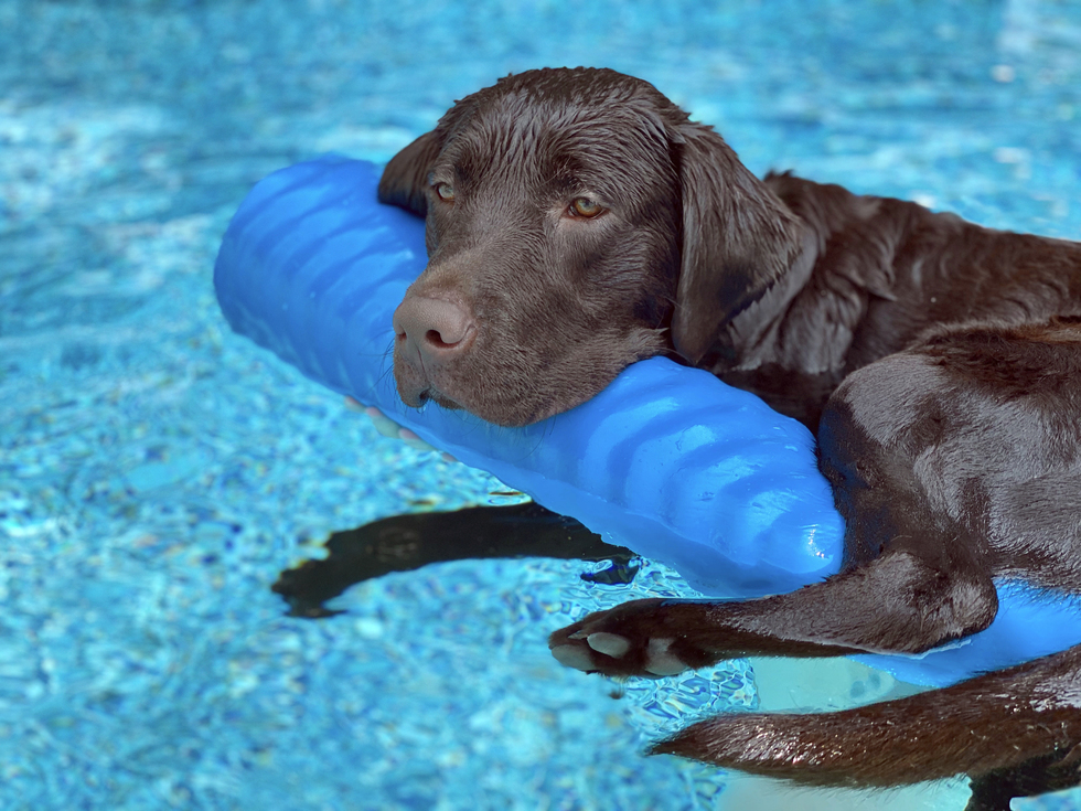 Acorn, a nine-month-old chocolate Labrador/golden retriever cross is floating on a blue pool noodle in an aqua blue swimming pool. His chin is resting on the noodle, as is his left rear leg. His front left leg is visible under the water, beneath the noodle. He’s looking off to the left of the camera frame with hazel eyes. His head and body are wet, and his tail is floating in the water next to the noodle, visible at the bottom right corner of the photo.