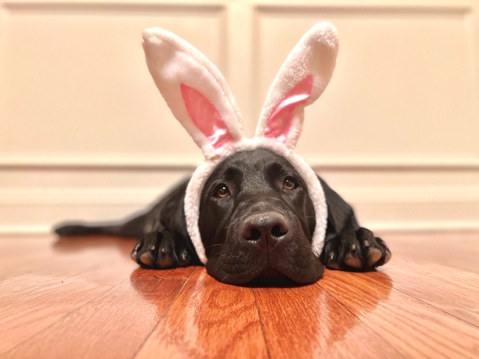 Po, a four-month-old male black Labrador retriever, lies on a shiny hardwood floor, the camera level with his face. His head is resting on the floor, a front paw splayed out on either side of his chin. He looks just over the camera with brown eyes. He is wearing pink and white bunny ears, which are standing straight up as part of a headband that encircles almost his whole head. The ends of the band come down to the floor on both sides, partially hidden behind his jowls.