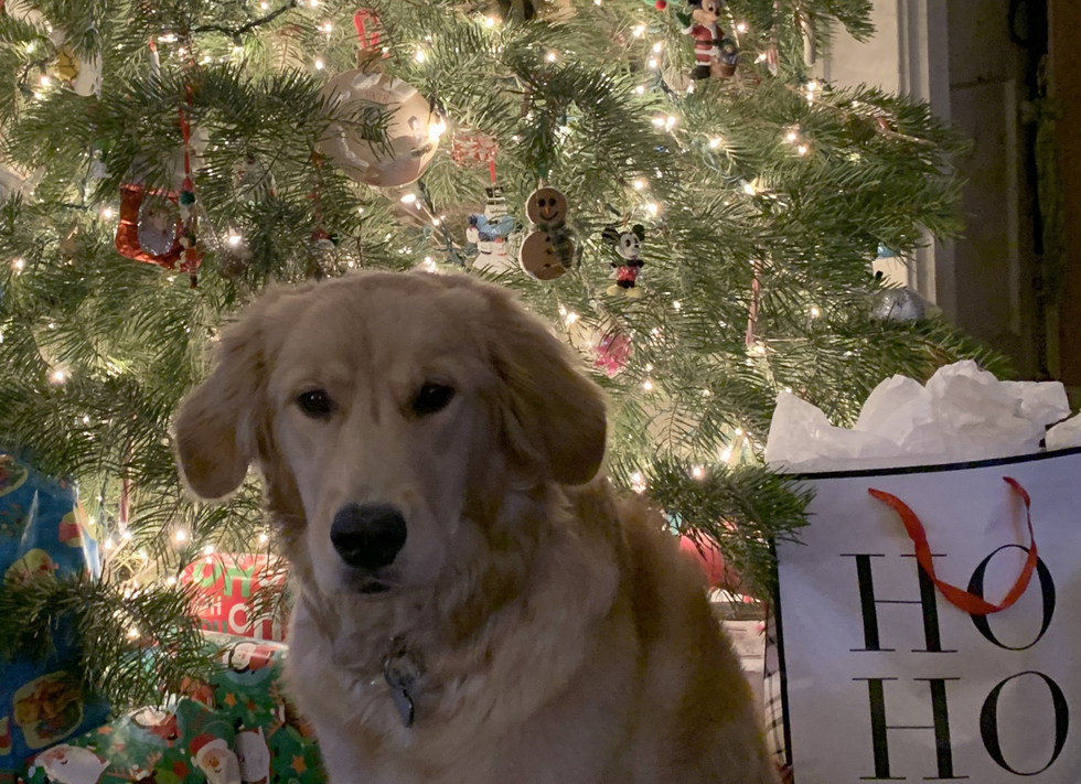 An almost full-grown female golden retriever named Ireland sits in front of a decorated Christmas tree, presents all around its base. She looks towards the camera with ears perked up, her right side illuminated by the white lights of the tree and her left side more in shadow. The tree behind her is lit with white string lights and decorated with various small holiday ornaments. Gifts are visible behind the dog on both sides. There is gift bag visible to the right of the dog and a pile of wrapped gifts on the left. The paper is a variety of blue, red, and green holiday patterns and the gift bag is white with red handles and white tissue paper poking out of the top.