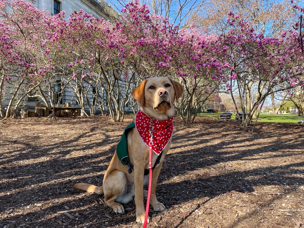 A 16-month-old yellow Labrador retriever named Darby sits facing the camera. He is wearing his green Seeing Eye puppy vest and a red floral bandana. He is sitting on wood chips and behind him is grass and a row of cherry blossom trees with bright pink flowers.