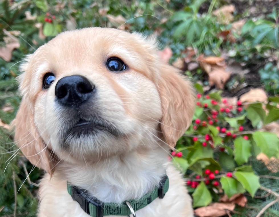 Holly, an eight-week-old female golden retriever, is sitting in front of a Holly bush during the holiday season. Her head is adorably tilted a little to her right as she appears to be looking over the left shoulder of the photographer.