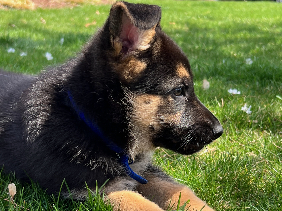 A close-up profile of extreme cuteness is eight-week-old German shepherd Jim. He is lying looking to the right with his little legs partially in view stretched out in front. His markings are of the classic German shepherd with a black body and light tan legs and face markings. His baby right ear is flopped down at the point. His new royal blue collar is peeking out from under his furry neck. It is springtime and he is on a fresh new bed of shaded grass with cherry blossoms scattered around by the wind. He is just beginning to learn about his surroundings and how to be a very good boy. Focused, sweet, and such a calm and steady spirit.