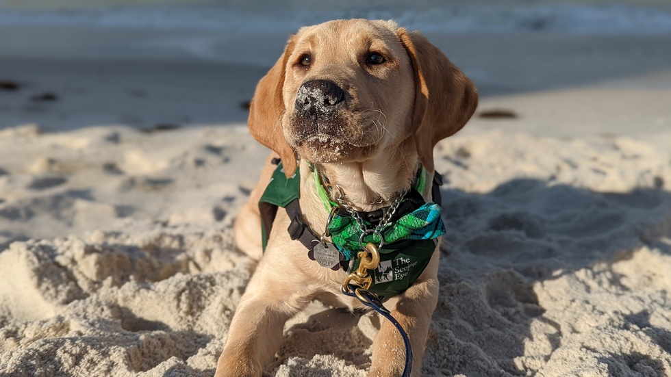 A young yellow Labrador retriever named Iowa lays on the sand in the early morning. The bright sun is coming from his right, shining across his face and body, leaving his left side in a shadow. He is looking off to the left side of the frame, past the camera. A sliver of the ocean can be seen behind him, across the top of the photo. He is wearing a blue and green plaid bowtie on his collar. You can tell from the sand stuck to his nose and mouth that he is enjoying his morning adventure!
