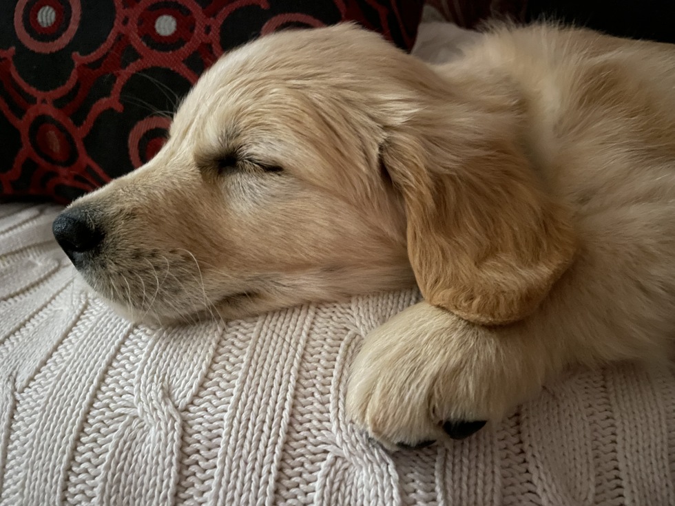 A very young male golden retriever named Gelert is asleep on an ivory braided blanket, which is wrapped tightly around his bed. The camera is close to his face as he sleeps peacefully, his left front paw resting by his chin. The tip of his ear, which is slightly darker than the rest of his light golden body, is draped over the top of his paw. He has very light gold fur around his lips, which sharply contrasts to the blackness of his nose. Behind his head is a black and red pillow that pops against the lighter colors of his fur and the blanket over his bed.