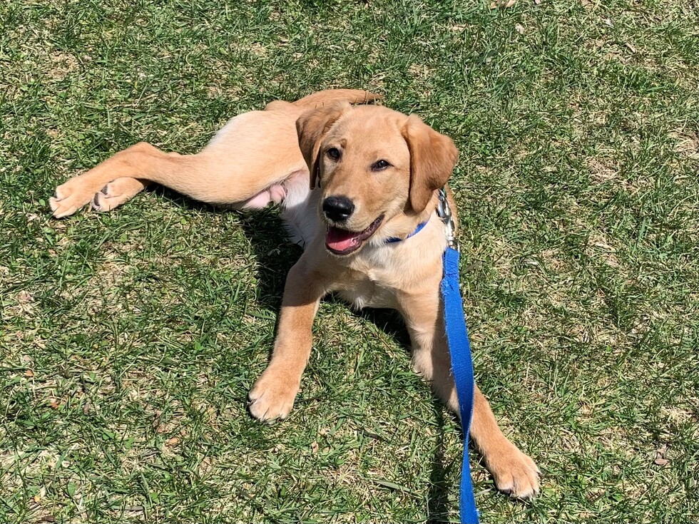 Robbie, a four-month-old yellow Labrador retriever, relaxes in a field of grass on a warm spring day. He’s stretched out on the short grass and looking up at the camera with his mouth open as if smiling in delight. He has a warm golden color to his body fur and a dark red color to the fur on his large, floppy ears. His eyes and nose are dark and shiny.