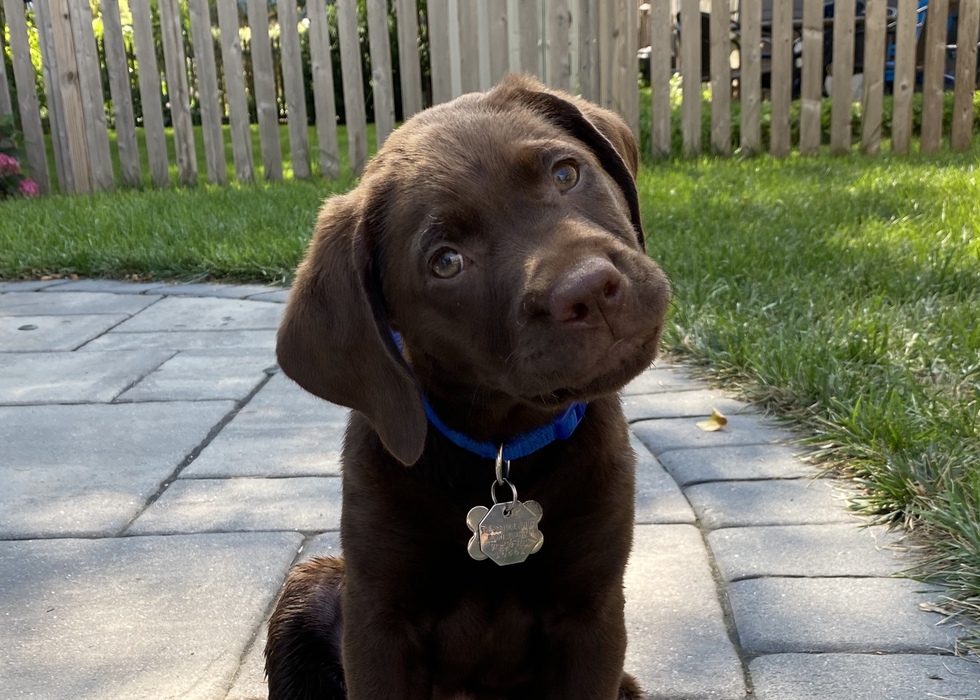 Did someone say they want to play? Harvey is an adorable 10-week-old chocolate Labrador retriever with soft fur and light brown eyes. He is pictured sitting on a stone patio in the late afternoon sun. He looks right at the camera with a cute and inquisitive head tilt that accurately reflects his playful and curious personality.