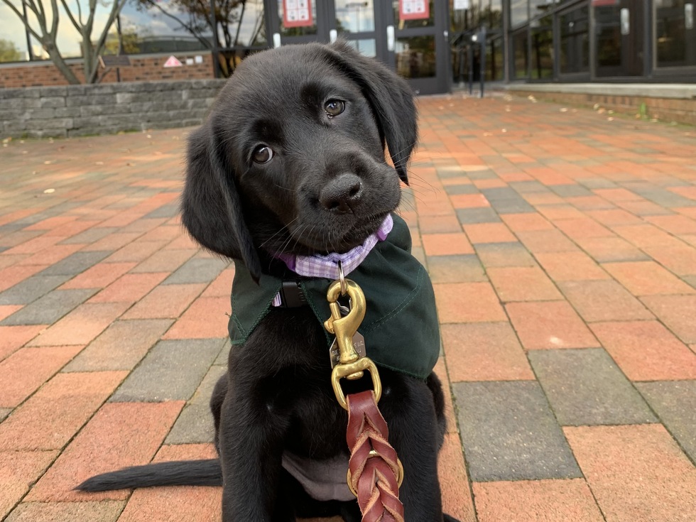 Nana, a seven-week-old female black Labrador/golden retriever cross sits on a red and gray brick patio, close to the camera. She looks directly into the camera, her head tilted to the left. She is wearing her green Seeing Eye puppy scarf, which hangs on her collar over her back so part of it is visible over both of her shoulders. A lavender and white gingham pattern collar is also being worn above the bandana, so most of the collar pattern is visible. From the lavender collar, a leather braided leash is attached, extending towards the camera. In the background is a red brick building, which has floor-to-ceiling windows and glass doors. To the left of the building is a gray stone garden ledge which wraps around a tree.