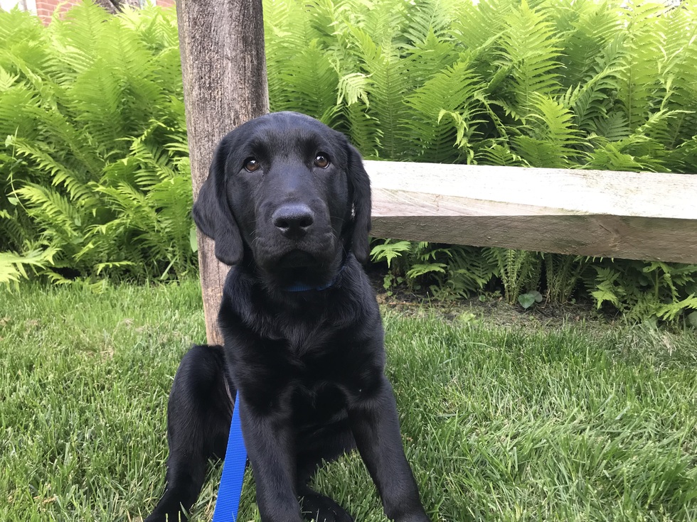 A young male black Labrador retriever named Forest sits on the grass in front of a split rail fence with lots of green ferns behind the fence. Although he is almost full-sized, he still sits like a puppy with his hips splayed apart. Totally relaxed is the mood he is sending us with his medium brown eyes and casual sit. He sports a royal blue collar with matching lead.