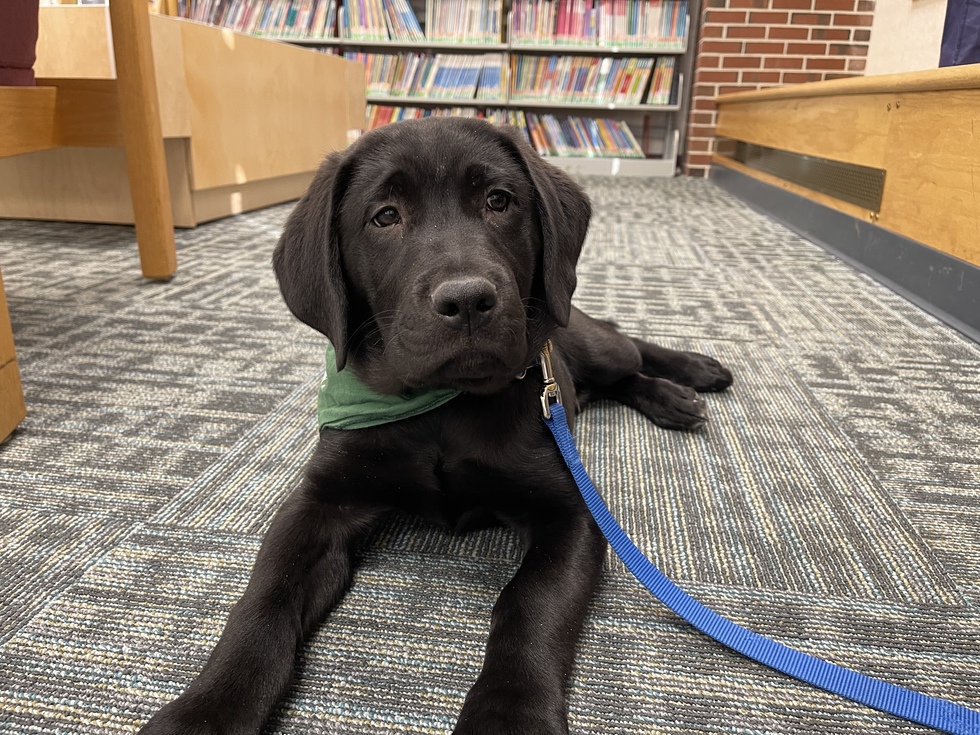 Pictured here is Oscar, a cute four-month-old black Labrador/golden retriever puppy who is ready to read! He is lying on the carpeted floor of a library. He is wearing his green Seeing Eye puppy scarf and his blue leash is draped in front of him. Behind him you see shelves filled with colorful books. You can see how soft his dark coat is as he looks intently at his raiser waiting for his next command.