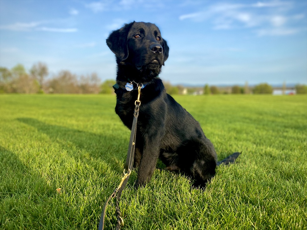 Liberty, a five-month-old black Labrador/golden retriever cross, is sitting upright in a freshly mowed grassy field on a spring day. In the distance are newly leafing trees and a beautiful robin's egg blue sky scattered with wispy white clouds. Liberty is sitting with his body facing left, his head held high and turned slightly to the right, and his chocolate eyes focusing intently on something in his view. His nostrils flare with excitement but he is a good boy to stay sitting, calm and in control. His blue bone-shaped name tag stands out on his shiny ebony coat. A rather proud and regal looking fellow.