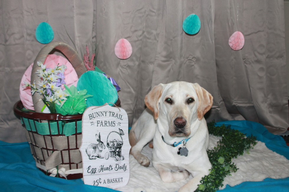 Falla, a pretty yellow Labrador/golden retriever cross, is laying on a white and blue blanket. She is surrounded by an Easter basket full of colorful Easter eggs and flowers. A small white sign in front of the basket reads BunnyTrail Farms, Egg Hunts Daily. She is looking right at the camera with expectant eyes, hoping for a visit from the Easter Bunny.