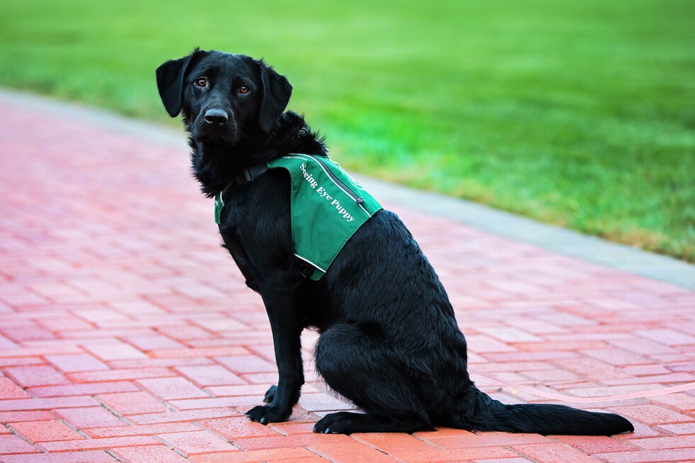 Pictured is Eva, a black Labrador/golden retriever cross. She is sitting on a brick pathway with her head turned looking intently at the camera. She is wearing her green Seeing Eye puppy vest and has a light pink leash that is slack and extending from her right side out of frame. Beyond her, a lush green field extends from the brick pathway.