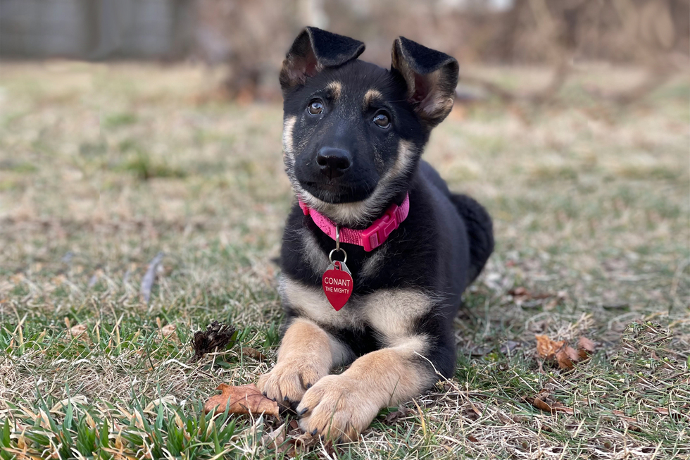 A 10-week-old black and tan German shepherd is laying at attention on the fall grass with a leaf under her paw. Her almost entirely black face has little tan spots above her eyebrows and a light tan band of fur circling the bottom half of her face, which looks like a big smile. She is looking right at the camera, her brown eyes full of wonder and anticipation. Her head is cocked and her not fully erect ears have the top half of them folded over. She is wearing a bright pink collar with a red name tag that reads “Conant the Mighty.”