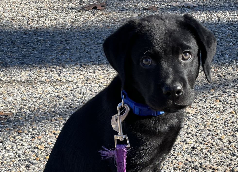 Atlas, a very young male black Labrador retriever, sits in dappled light on a pebbled pathway. He pleadingly looks at the camera with big round eyes that are light in color since he is still so young. The sun shines on his fuzzy puppy fur and his wet nose. Around his neck is a bright blue collar with a well-used leash attached to the metal ring.