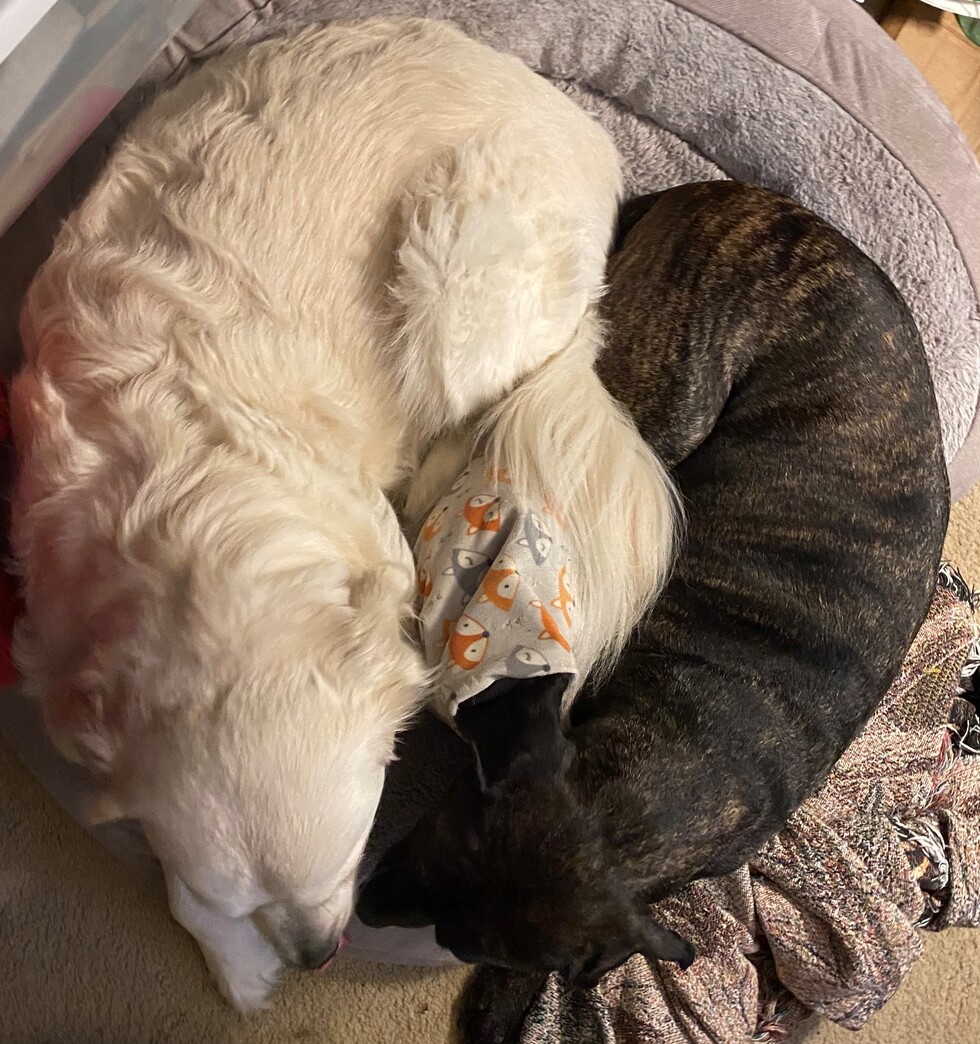 Both Blue (golden retriever) and Guinness (plott hound mix) are adopted from a rescue. Blue's owner unfortunately passed away unexpectedly, we fostered him, and then he was placed in training as a service dog. After a few months of training, it was decided he would be a better family dog than a service dog and we decided to adopt him. Guinness is our senior dog we adopted as a puppy who was originally very grumpy about having a new energetic younger brother (she was not unhappy about seeing him off to training). As you can see, even though she pretends on occasion she's not his biggest fan, as she's slowed down over the years, she's a fan of snuggles and willing to share her dog bed with him. On days she has more energy, she will even initiate play. On the other days, Blue is more than happy to just be next to her.