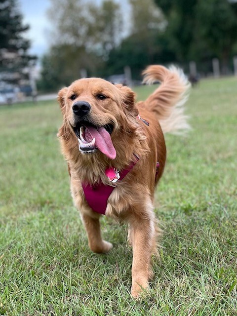 Luna is a 2-year-old Golden Retriever. We rescued her from a barn in the middle of winter. The puppies only had warming lights and wood chips to lay on in below-freezing temperatures. The puppies had to compete for food and water stored in gallon-sized buckets. Their fur was very unhealthy and Luna had two different illnesses caused by bacteria that could have been taken care of through a vet visit. After a few months of us taking care of Luna, she improved greatly. She still had a bit of food aggression, but we have since worked through that. Luna also struggles with some reactive behaviors. She is not yet confident in all situations, but we are working through that. She has a loving and caring personality. She loves to snuggle with her humans and is very smart. Her grandma dropped mail on the ground and Luna, without being asked, went and picked them up. She has a sister named Winnie, and they are the best of friends. We could not imagine life without Luna.