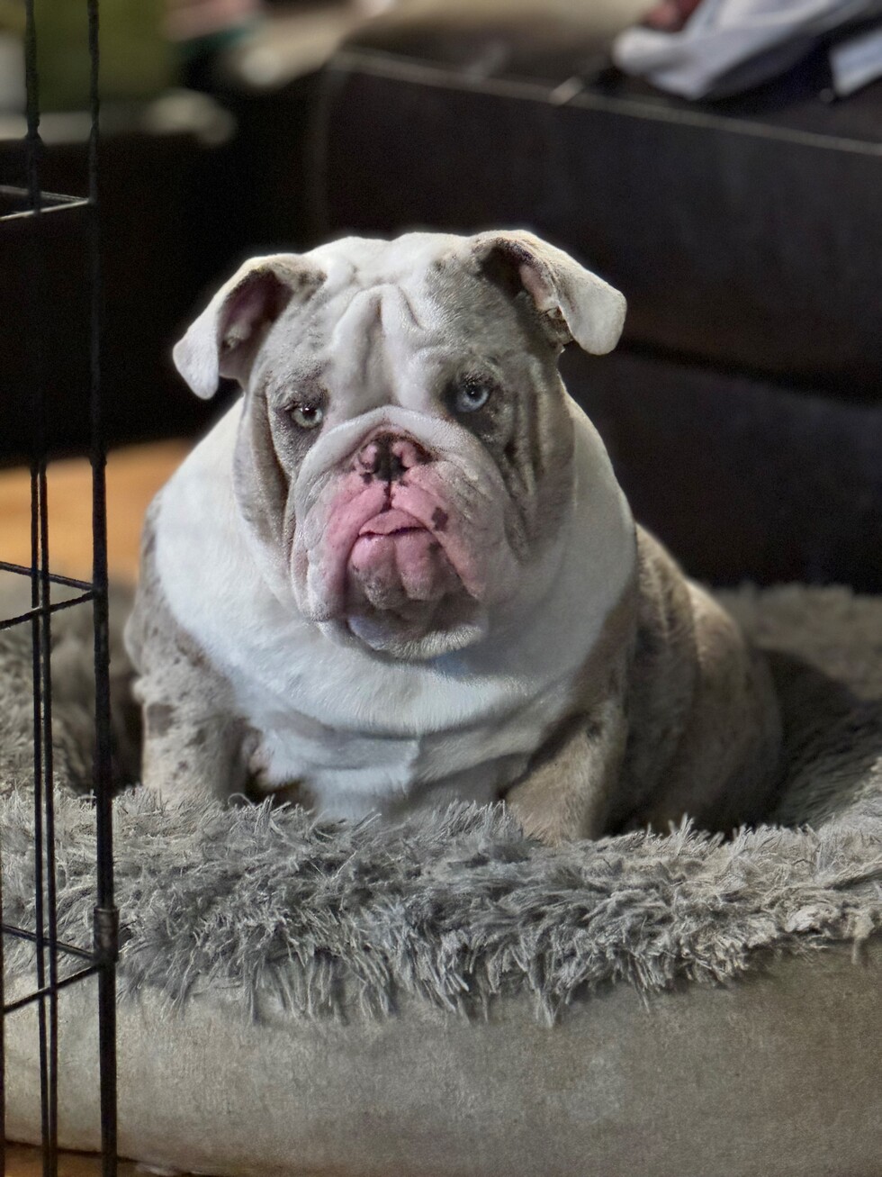 Blanca came into our life July 2023 as a tiny pup. She is the daughter of our oldest English Bulldog (Latto). We fell in love with her personality and those gorgeous blue eyes. Blanca has been an amazing addition to our family. She loves to sunbathe and is the hardest pup to get back inside after play time. Blanca is very protective over her human mom and was an amazing support animal as she battled breast cancer. Blanca loves new toys and her favorite cookie treats. Napping is her specialty, she snores the loudest!