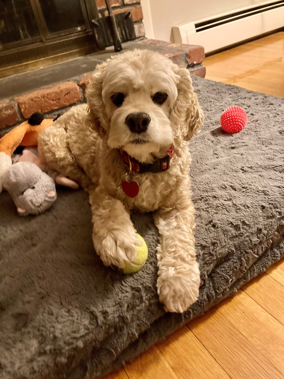 Jordan is my 10-year-old foster dog who came to me on Valentine's day through the Cocker Spaniel Rescue of New England. She was surrendered because her family felt they couldn't give her time and attention. She is a sweet, Velcro cocker spaniel with very serious health issues. She has lung disease, heart failure, mitral valve disease and a slow, irregular heart beat. But that doesn't stop her from playing, taking walks, and dashing up the stairs! She came to me not knowing any commands. She's made great progress in a month to learn Sit, Target, Stay, Come, and Down. You CAN teach an old dog new tricks.