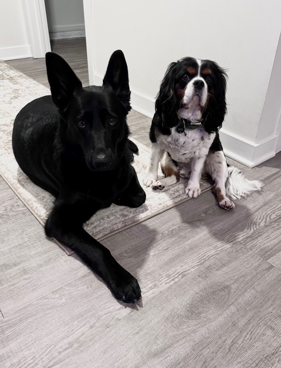 Gio is a tricolor Cavalier King Charles Spaniel who was brought to the US from Ireland. Fia is a working line German Shepherd who is a Police K9 in Connecticut. Fia is titled in IGP2, PSA-PDC and is certified in narcotic and explosive detection. They are the oddest looking duo but the best of friends.