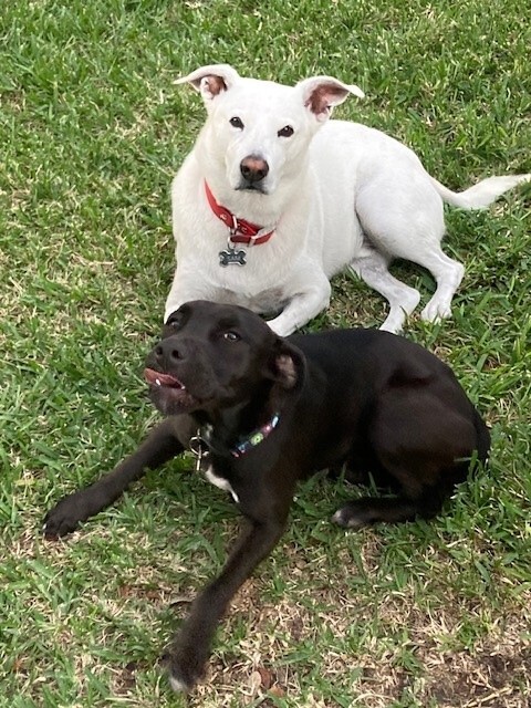 I found Sam 10 1/2 years ago while marathon training with friends, he came out of a park and ran 6 miles with us at which time we locked him in a friends backyard. I took Sam home later that morning hoping to find his owners or a forever home, which his home ended up being mine. Bella was a stray living at Collier Pool Park for several months, being fed by people picnicking and swimming. I took Bella to get fixed and had planned to return her to the park after a few days of recovery, needless to say she has been with me and Sam now for 2 1/2 years now. Sam and Bella are inseparable and she keeps him young by chasing and wrestling with him. They both love their daily walks and lying on their cots in the driveway watching the cars and people in the neighborhood go by.