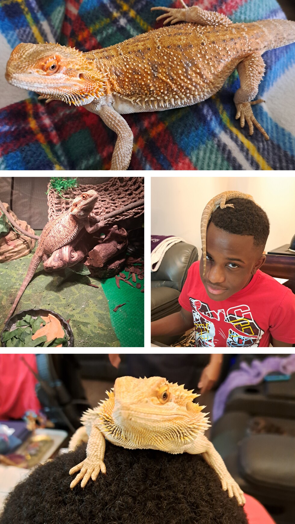 Pet's StoryComet is an amazing bearded dragon, he brings such joy to our family. He loves to eat sweet potato, kale, and of course crickets and meal worms. His most favorite spot to be is sitting on his brother Parker's head. We love all of his scales, every one of them fills our hearts!
