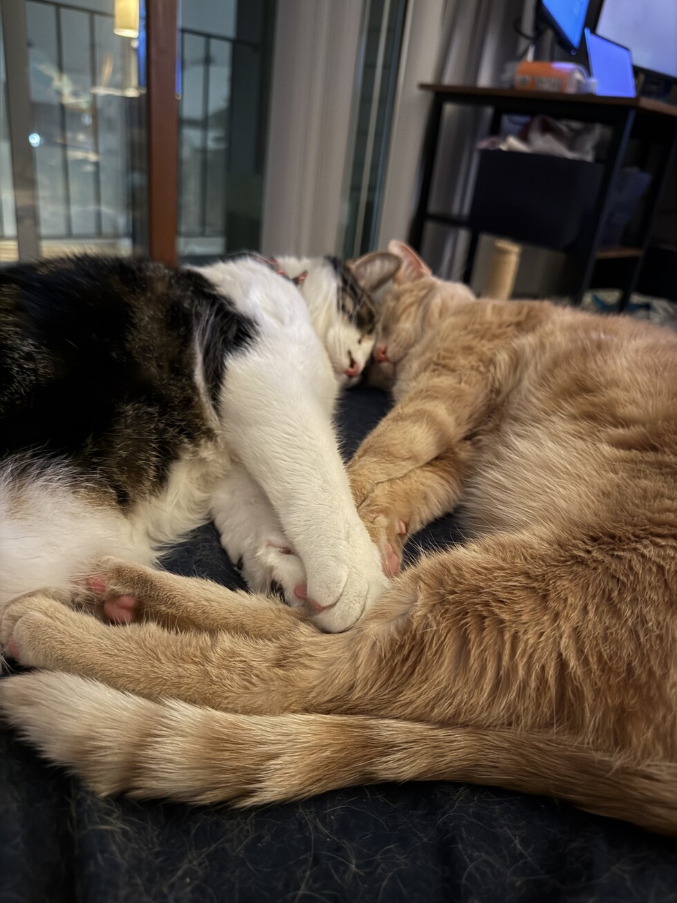 You can always find Mater in a high up place, even going as far as to jump five feet from the counter to the top of the cabinets with ease since he was a little baby. Lightning enjoys to curl up in a cat bed or atop one of the cat trees. They love to test my patience after discovering the ability to open cabinets and drawers, resulting in more child locks than most people have for small children.
