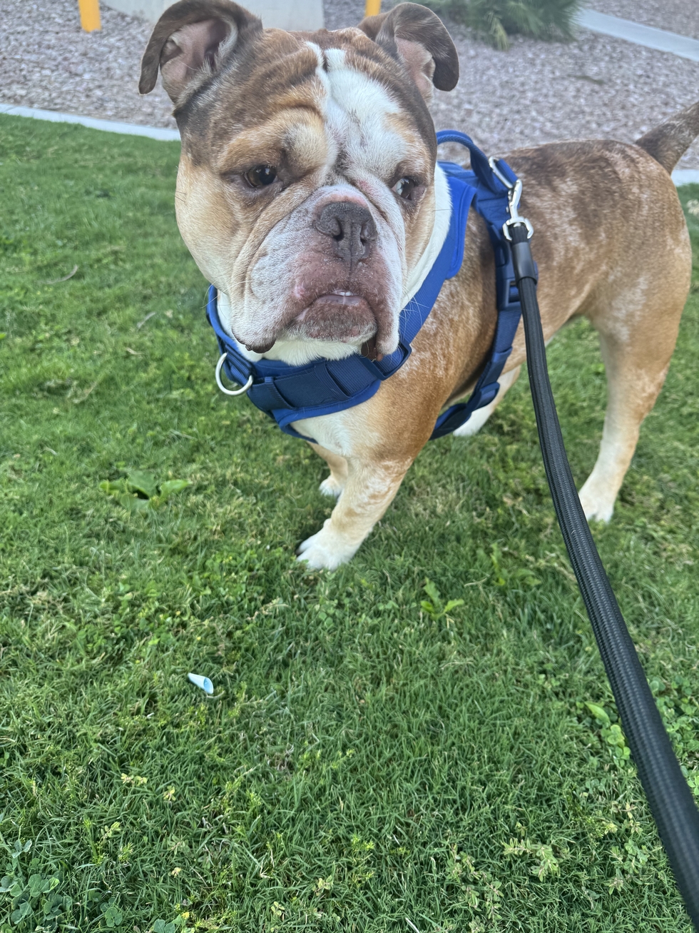 Pet's StoryMeet Blue Porkchop, a 4‑year‑old Old English Bulldog with the biggest heart, the wiggliest butt, and absolutely no understanding of personal space. Blue joined our family at just 2 months old, and from the moment he waddled through the door, he has been everyone’s best friend.