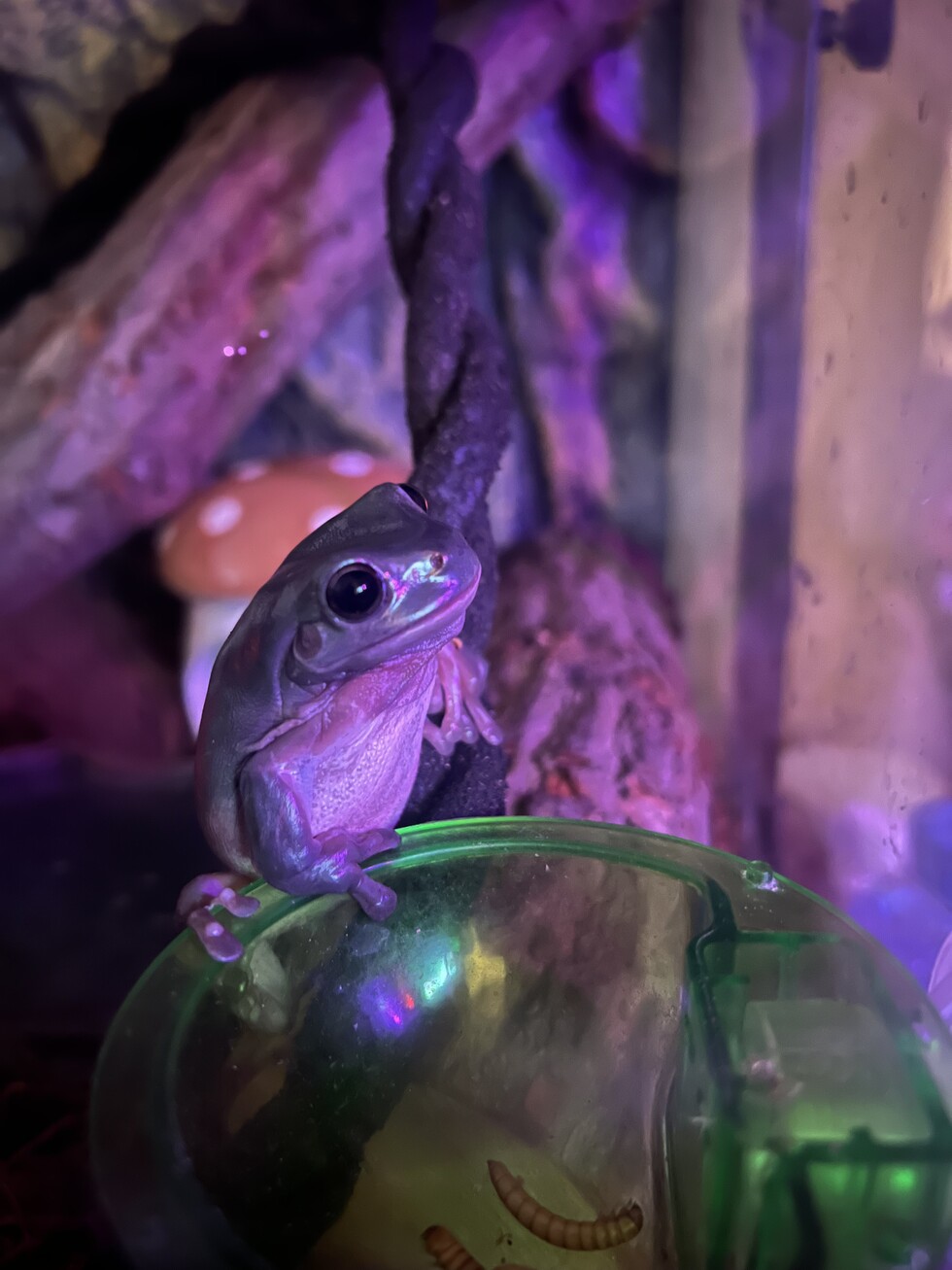 Pet's StorySimon was adopted from the Saratoga Reptile & Amphibian Exposition in January of 2023. He just celebrated his 3rd birthday and upgraded to a new and larger terrarium. He is nocturnal so he spends most of his day suctioned to the glass of his tank or in his moss hut sleeping. He loves to come out at night and "hunt" for his food...even though it's in the same spot every single night. He is very goofy and the most lovable frog you'll ever see!