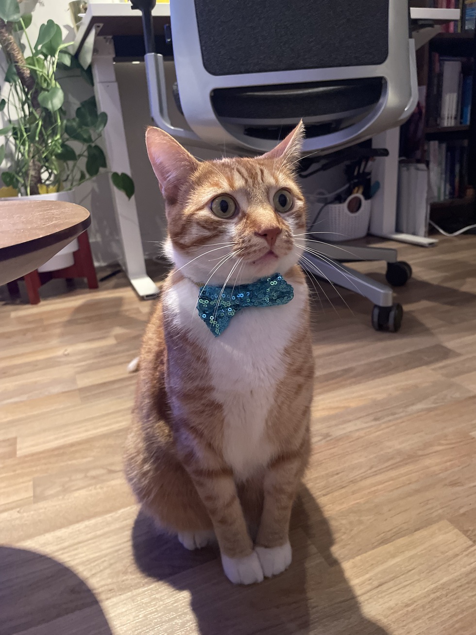 Louis is a quirky cat who loves his parents who love beer. He was not enthused to wear this bow tie for his birthday. He was told if he wins this contest he will get a stick of butter.