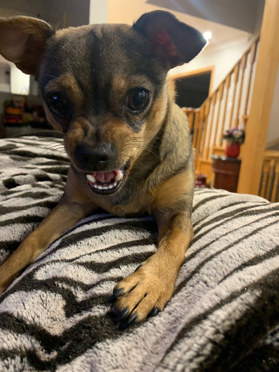 Every morning she wakes up looking cute but ready to rumble. She hates everyone equally. Friends, family, strangers, delivery drivers, squirrels… all enemies. If you come within biting distance, she will absolutely take that opportunity to remind you that personal space is not optional.