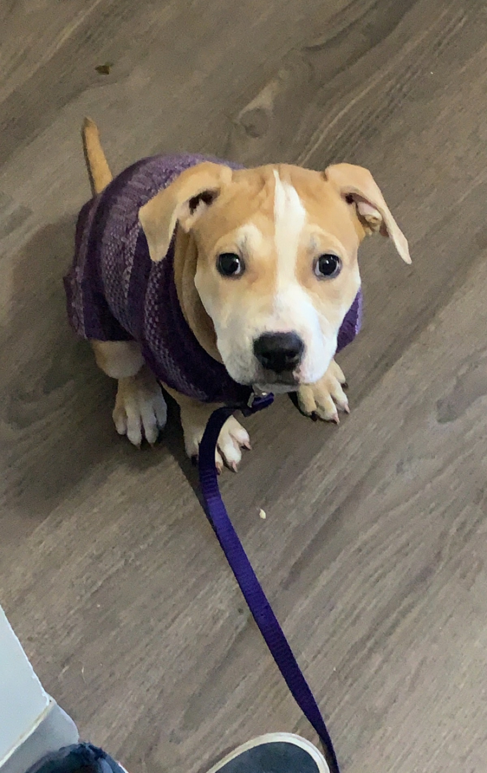 Boo is a pitbull/staffy mix with a face full of character and a personality even bigger than her smile. She has that perfect mix of tough and sweet — strong, loyal, and protective, yet a total cuddle bug with the softest heart.