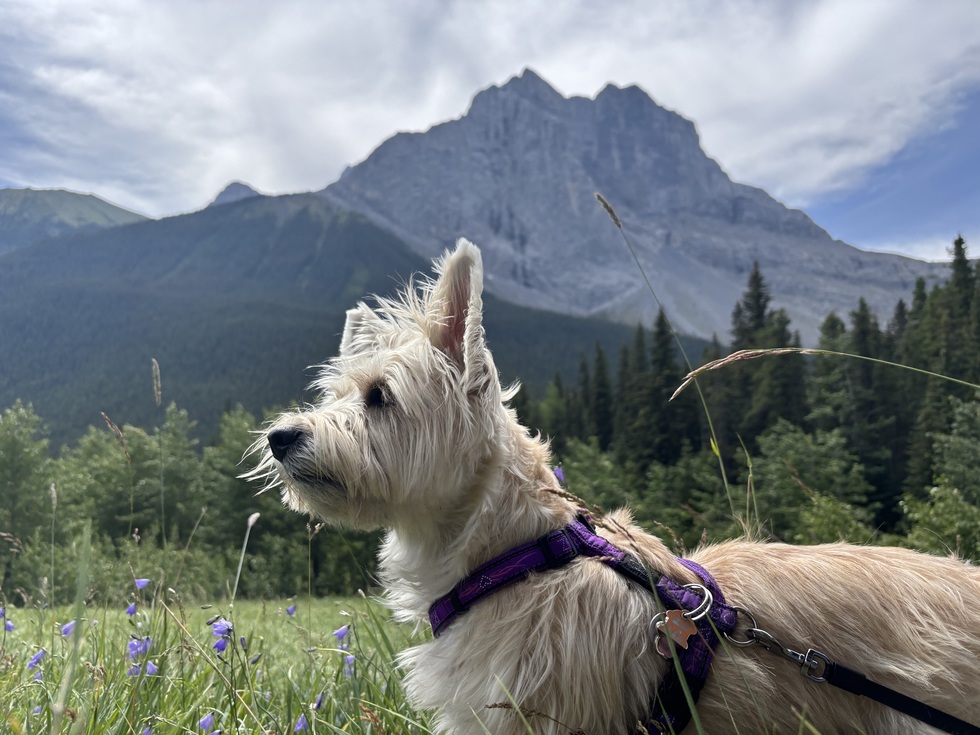 She out exploring the Bow river and mountain trails in the Bow valley. She’s loves small children and belly rubs and agility class. A over all great small dog