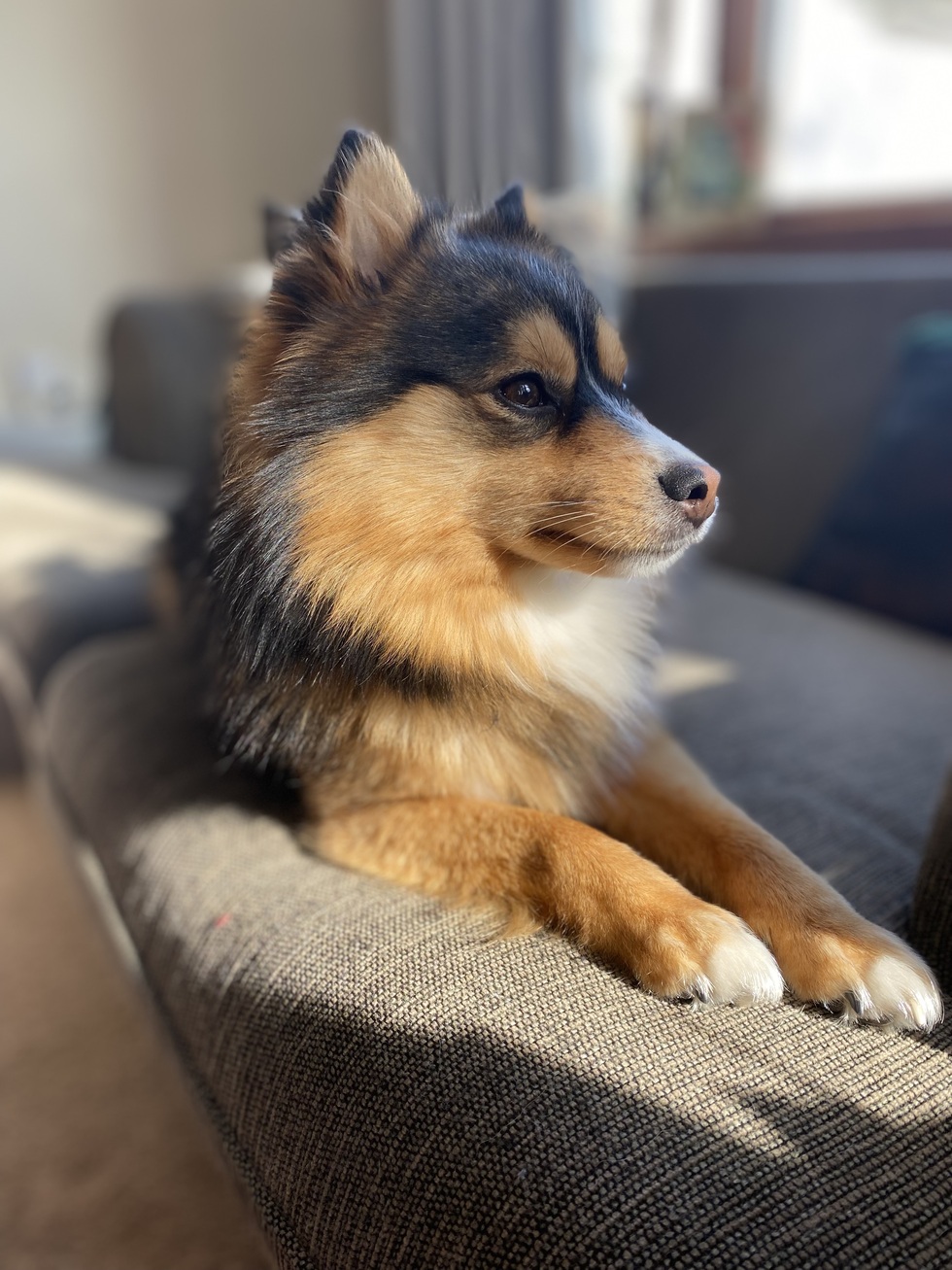 He is a Pomsky and a very lovable dog. He came to live with us 2 yrs ago . He greets me at the door every day when I come home from work. Every where I go in the house, he is right there. Gets very jealous when my husband tries to kiss me. He loves being the center of attention and he is a beautiful dog.This dog very seldom barks except for at the mailman. His bark is bigger than his bite. You pet him once, he is your friend forever